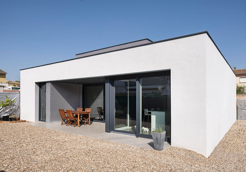La intervención se ubica en una urbanización parcialmente consolidada del sureste del municipio, en una parcela resultante de la agregación de dos solares estrechos (5,8 m de ancho por 17,4 m de fondo cada uno), pertenecientes a un desarrollo de viviendas en hilera cuya construcción quedó incompleta. La fachada principal de la vivienda se dispone con orientación sureste hacia el jardín privado, protegido del viento dominante (cierzo) por la propia volumetría urbana.